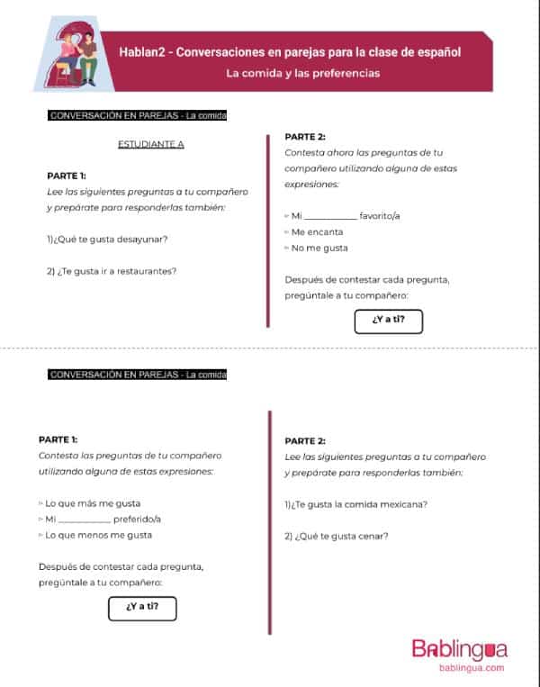- Student B responds using one of the suggested expressions of preference and then asks, ¿y a ti? so that Student A also provides an answer.